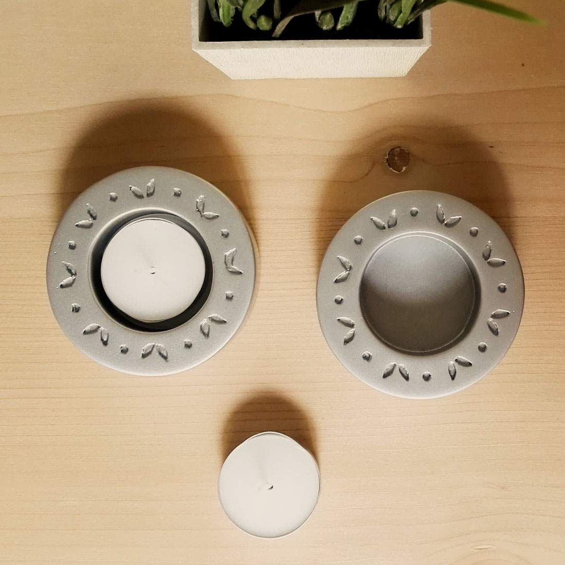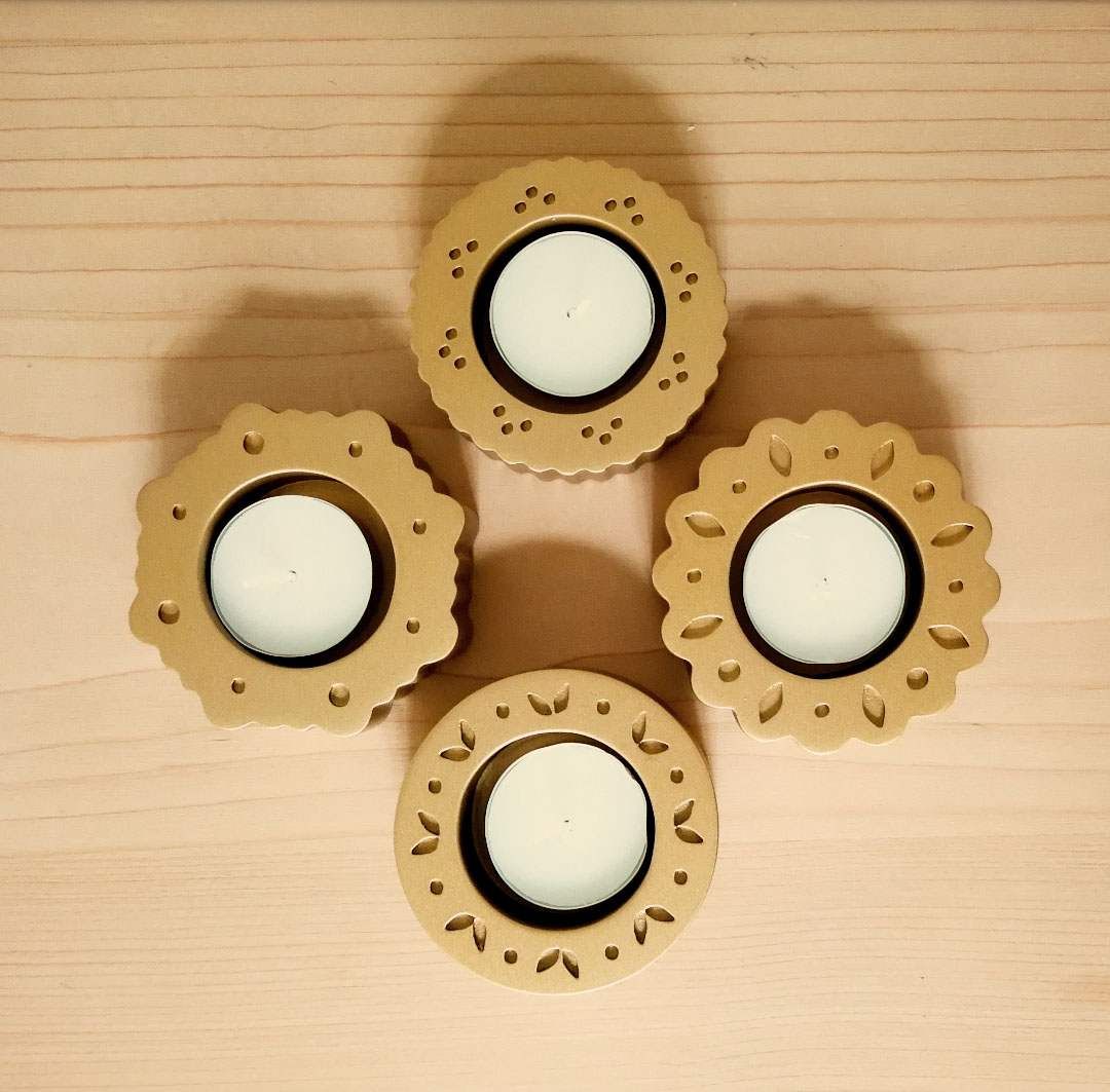 Inspired by a combination of biscuits and lace, this wooden tea light holder set is quite the heart warmer. It makes a sweet gift for a birthday, house warming party or seasonal holiday such as Mother's Day, Diwali, Thanksgiving and Christmas.