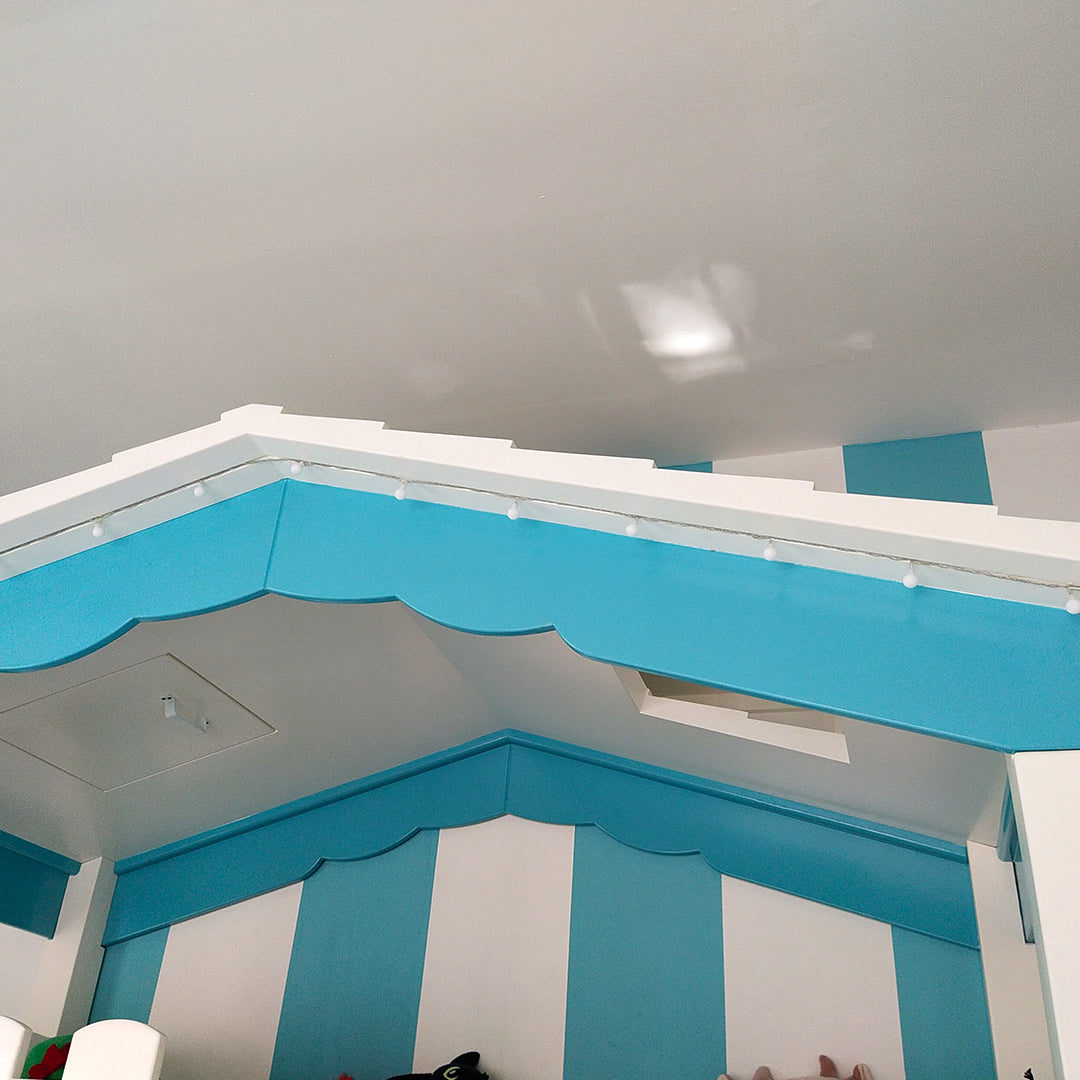 A bunker bed in the shape of a house with a door, 2 roof windows that open, and 2 floor drawers. Any color combinations are possible.